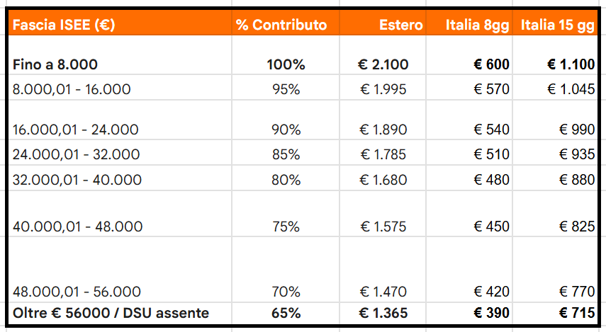 - Importo del contributo: 600€ per soggiorni di 8 giorni, 1100€ per soggiorni di 15 giorni.