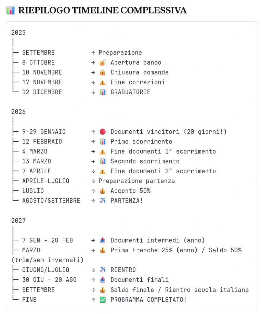 Dopo la pubblicazione delle graduatorie (12 dicembre 2025) e il caricamento della documentazione (entro febbraio 2026), le partenze avvengono generalmente ad agosto/settembre 2026. Alcune agenzie consentono iscrizioni anticipate.