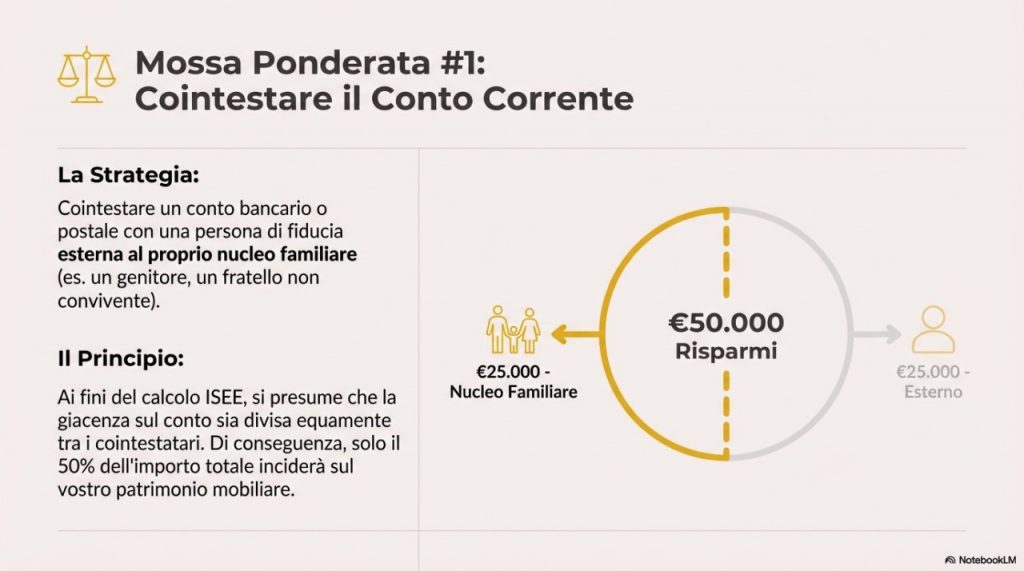 - Esempio pratico: Un conto con 50.000 € cointestato con un soggetto esterno viene conteggiato solo al 50%. Per l’ISEE, il patrimonio mobiliare scende quindi a 25.000 €.