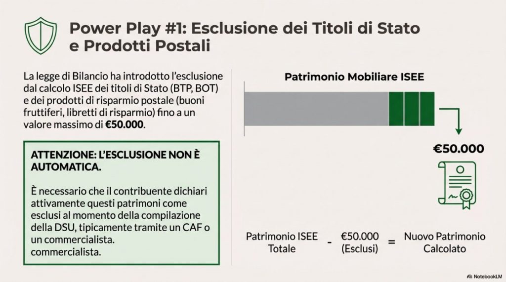 - Esempio pratico: Una famiglia ha 50.000 € in banca. Spostandoli integralmente in BTP, questi non vengono più conteggiati come patrimonio mobiliare. Poiché l’ISEE somma i redditi al 20% del patrimonio, togliere 50.000 € di patrimonio riduce l’indicatore finale di circa 10.000 € (valore che poi viene diviso per la scala di equivalenza della famiglia).