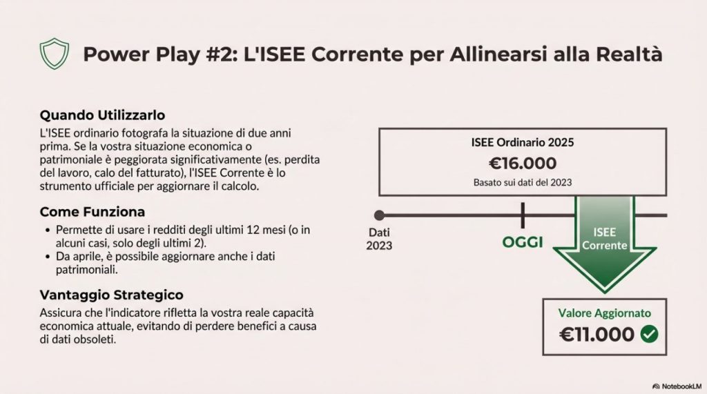 - Esempio pratico: L’ISEE 2026 usa i redditi del 2024. Se nel 2024 un componente ha perso il lavoro, l’ISEE corrente permette di usare i redditi degli ultimi 12 mesi (o anche solo 2 mesi in certi casi), abbattendo drasticamente il valore se il reddito è calato del 25% o il patrimonio del 20%.