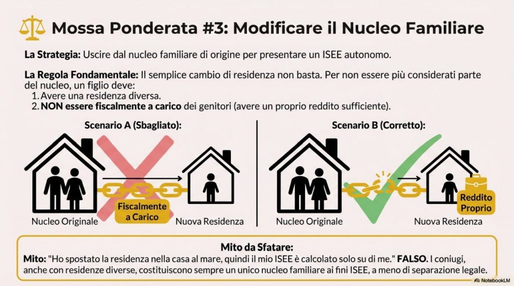 - Esempio pratico: Un figlio lavoratore con un reddito di 30.000 € che vive con i genitori sposta la residenza. Il reddito della famiglia cala di 30.000 €, abbassando l’ISEE complessivo del nucleo originario.